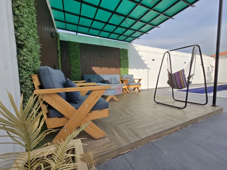 الوصف شاليه بطابع بوهمي لتتمتع بالفخامة والراحه و تخيل نفسك وانت تستيقظ على منظر حديقتك والمسبح الخاص حيث يمكنك الأسترخاء وتناول الافطار في الهواء الطلق …